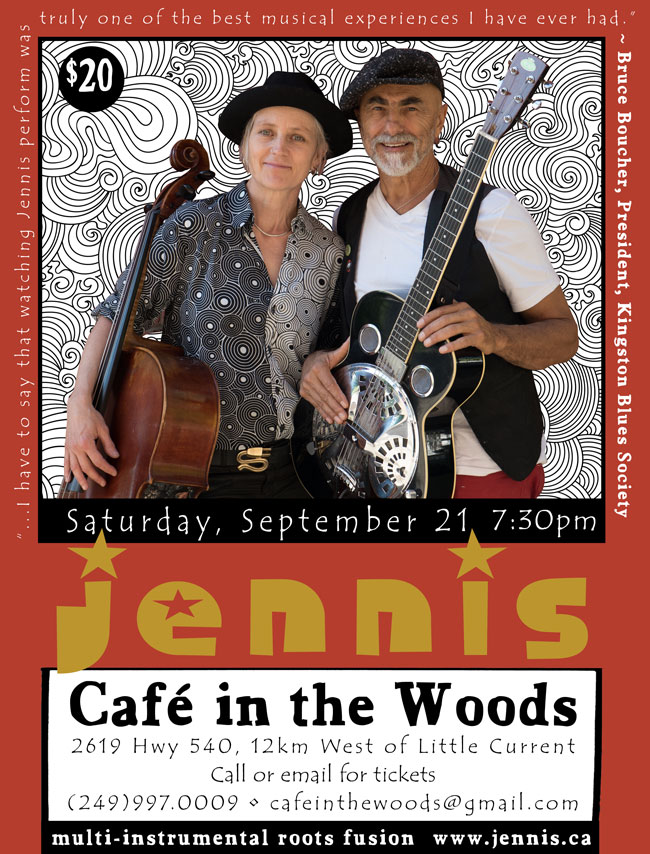 Wow - as usual, the summer is flying by. Hope you are enjoying it as much as I am. Thank you to all those who came to our art show opening. The paintings will remain at the Red Brick in downtown Guelph until Sept. 7. Jennis has some interesting gigs in Sept - see details below. Also, Jennis' CD release parties in October are quickly drawing near - see details below.